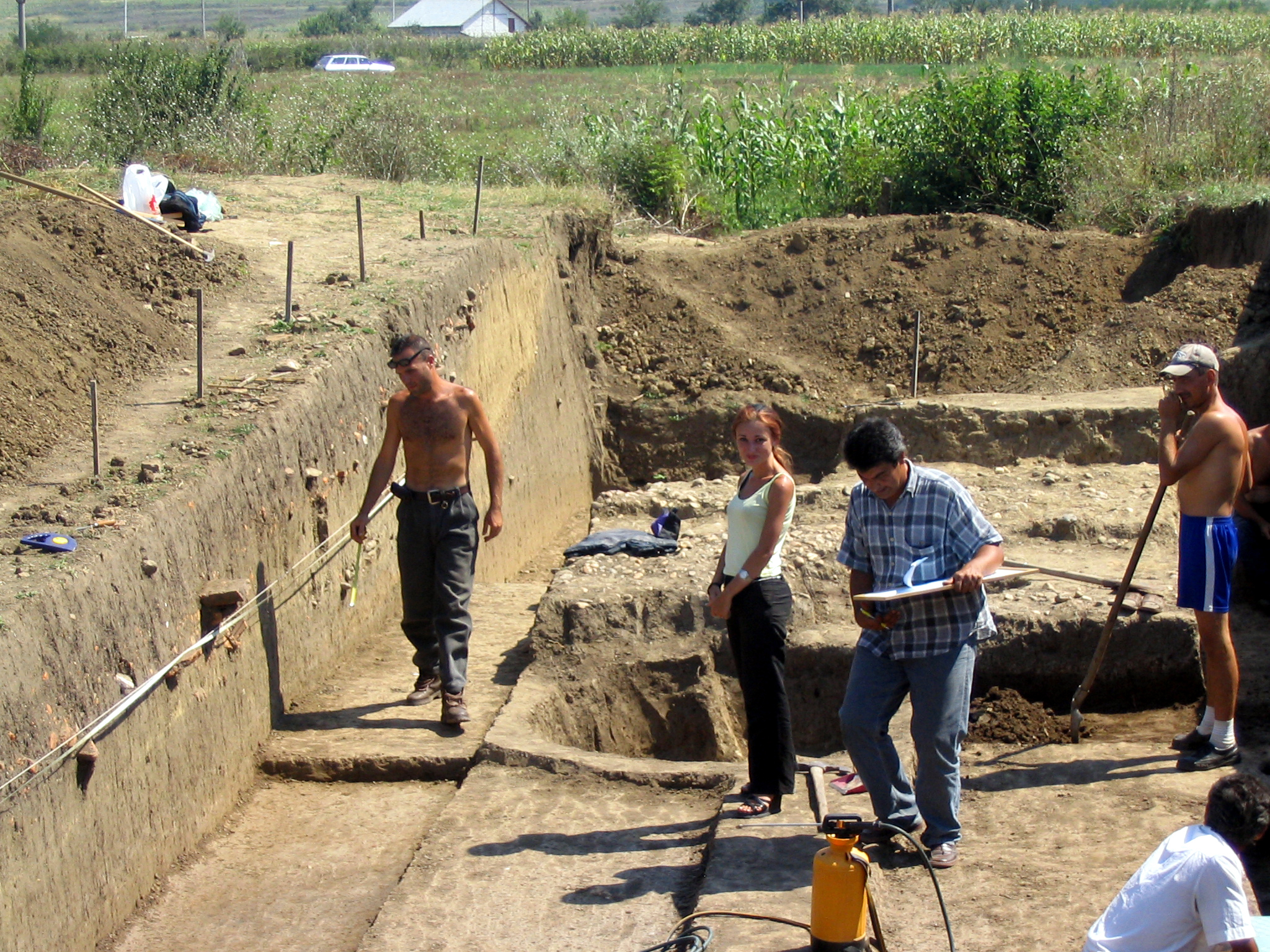 Imagine fotografică dinspre finalul campaniei 2004. Ruleta este întinsă de-a lungul profilului, pentru desen. Dr. Bondoc inspectează profilul, înainte de a transmite măsurătorile colegului Bălteanu (cămaşe caroiată), pentru măsurători. Asistă şi oferă sprijin o studentă din Alba Iulia. În planul doi se văd rămăşiţele Via sagularia. În următorul plan se vede că secţiunea arheologică a fost astupată în dreptul incintei de fortificare (cercetate în 2003) pentru a proteja rămăşiţele materiale ale fortificaţiei, până în ziua restaurării. Click aici pentru o reprezentare cu rezoluţie sporită (2700 K) |