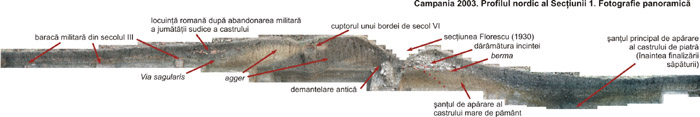 Fotografie panoramică ilustrând profilul nordic al Secţiunii 1, spre sfârşitul campaniei 2003. Profilul reprezintă o lungime de 44 de metri. Sigur, cei care nu citesc româneşte vor avea nevoie de o traducere. Organizatorul şantierului promite că o va asigura, la faţa locului... Fotografia este interesantă, presupun; ceea ce sigur vă putem spune este că secţiunea reală prin pământ este şi mai spectaculoasă.